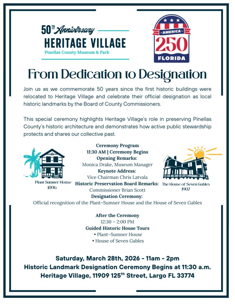 Now, after five decades at Heritage Village, these two buildings meet the criteria for local historic landmark designation—an acknowledgment that affirms their historical and cultural significance, strengthens eligibility for preservation funding, and reflects a high standard of professional stewardship. Recognition by the Pinellas County Board of County Commissioners further underscores their importance as integral components of the county’s heritage.